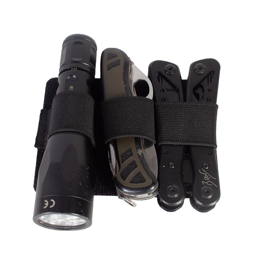 - Equipado com elásticos resistentes, é ideal para transportar carregadores, lanternas, canivetes e outros acessórios.