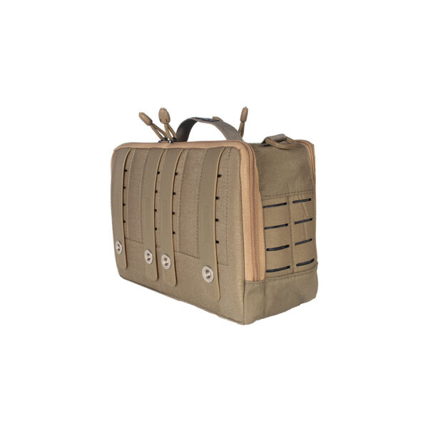 - As laterais, parte frontal e fundos possuem sistema MOLLE, permitindo adicionar outros bolsos ou fixar a bolsa em mochilas, coletes ou outras plataformas compatíveis.