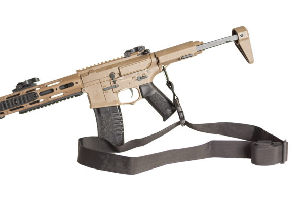- Configuração flexível que permite que uma parte da bandoleira fique conectada ao operador e a outra à arma, facilitando o acoplamento quando necessário.