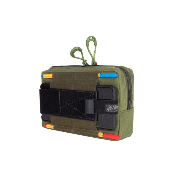 O elástico frontal oferece espaço para carregar um torniquete ou o celular, enquanto a parte interna é ideal para armazenar itens médicos essenciais, como duas bandagens do tipo Tactical Medical Solution e Combat Gauze QuikClot, recomendadas para controle de sangramentos maciços.