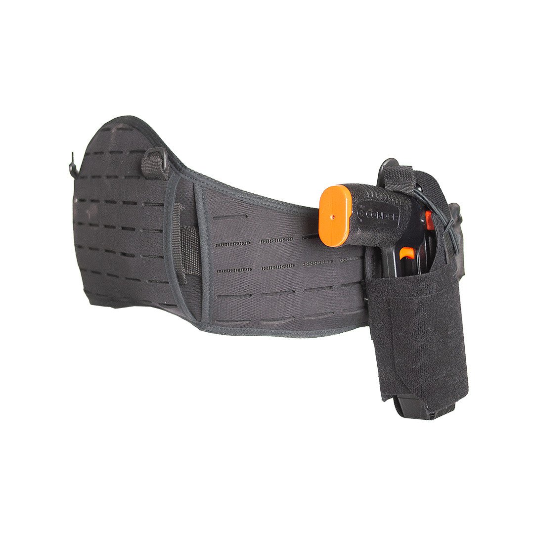Fabricado em Cordura 500, conhecido por sua resistência a abrasões e durabilidade em condições extremas. A manta plástica interna proporciona rigidez estrutural, mantendo a forma do coldre e protegendo o equipamento.