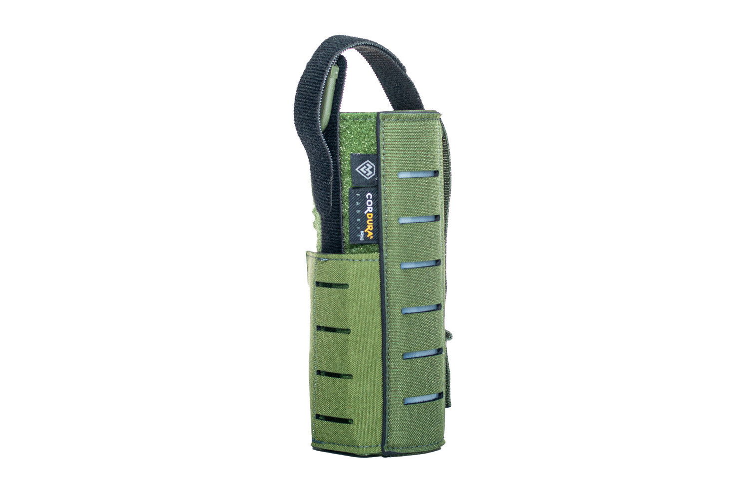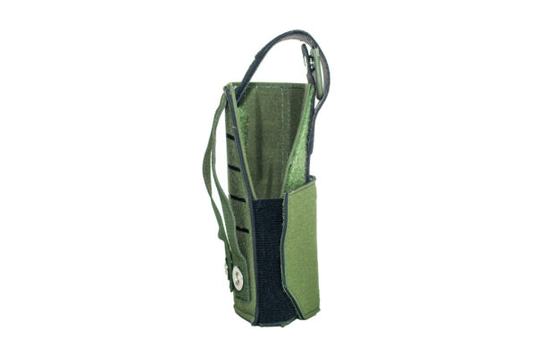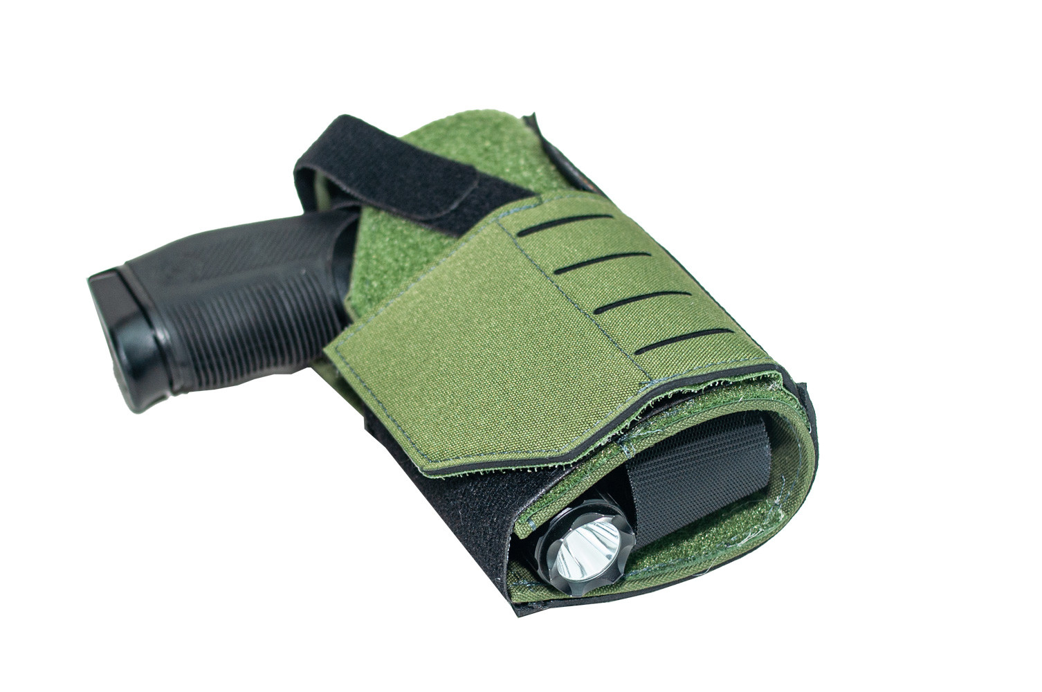 Fabricado em Cordura 500, conhecido por sua resistência a abrasões e durabilidade em condições extremas. A manta plástica interna proporciona rigidez estrutural, mantendo a forma do coldre e protegendo o equipamento.