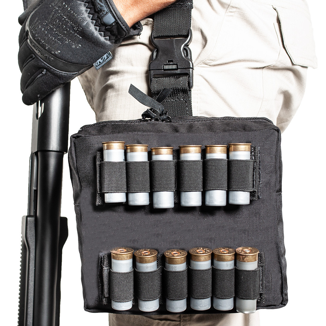 Com espaço interno amplo, o bornal comporta munições de calibre 12 ou granadas, além de oferecer capacidade para 2 cargas externas removíveis.