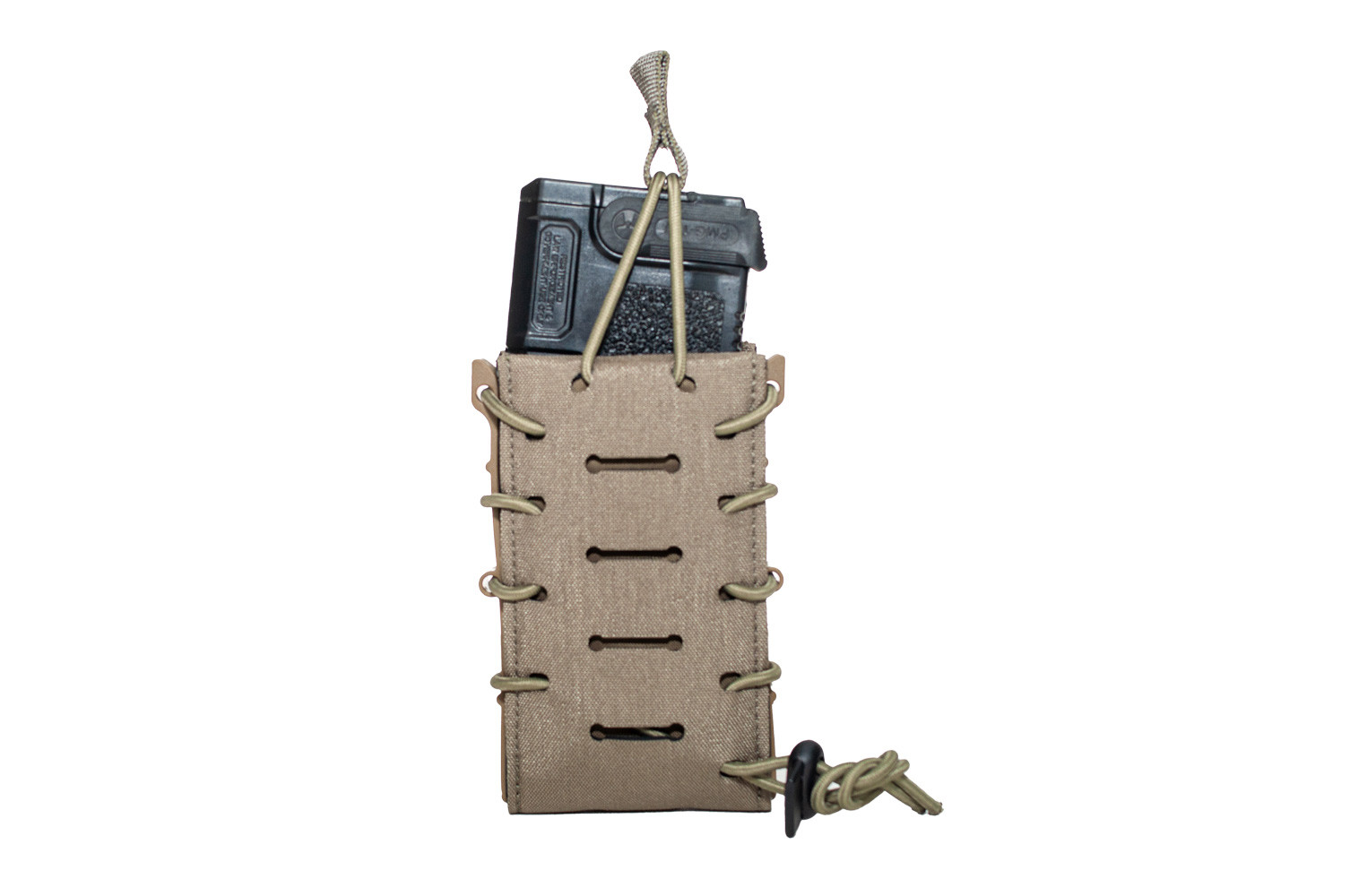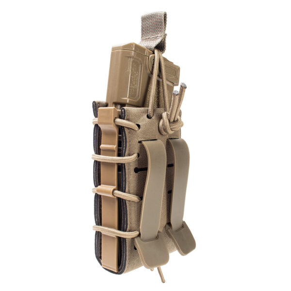 - Compatibilidade com Múltiplos Calibres: Suporta carregadores de fuzis 5.56mm e 7.62mm, ajustando-se automaticamente à espessura do carregador com o uso de elásticos tensores e laterais expansíveis.